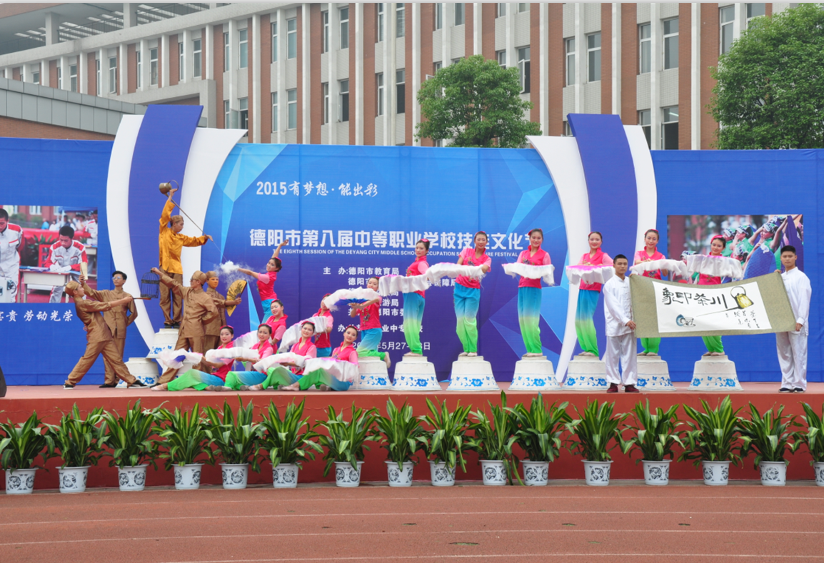 5月27日—28日,由德陽市教育局、德陽市人力資源和社會保障局、德陽市財政局、德陽市旅游局、共青團德陽市委共同主辦,什邡市職業(yè)中專學(xué)校承辦的德陽市第八屆中等職業(yè)學(xué)校技能文化節(jié)在什邡職中隆重舉行,技能文化節(jié)設(shè)技能項目比賽和文化項目比賽兩個大項。黃許職中帶來的,融入了長壺功夫茶、武術(shù)、賞花遛鳥、讀書品茗等元素在內(nèi)的綜合才藝表演舞蹈《川茶印象》,生動再現(xiàn)了四川的茶館文化,真實的反映了四川人不溫不火,直率簡單,樂于玩耍,知足常樂的生活習(xí)俗和積極向上的生活態(tài)度。